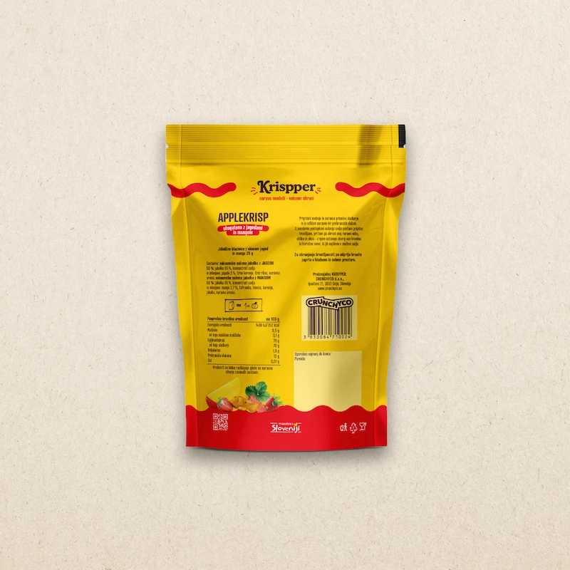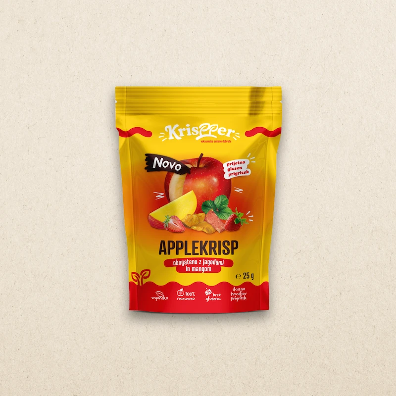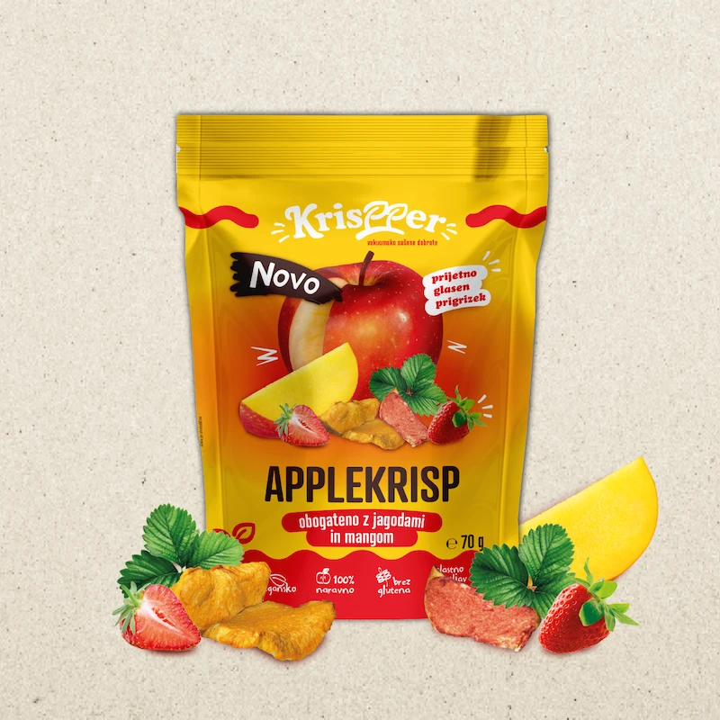 Applekrisp jabolčne blazinice so hrustljav sadni prigrizek, obogaten z naravnim okusom jagod in manga. Nudijo ravnovesje med naravno sladkostjo in svežino.