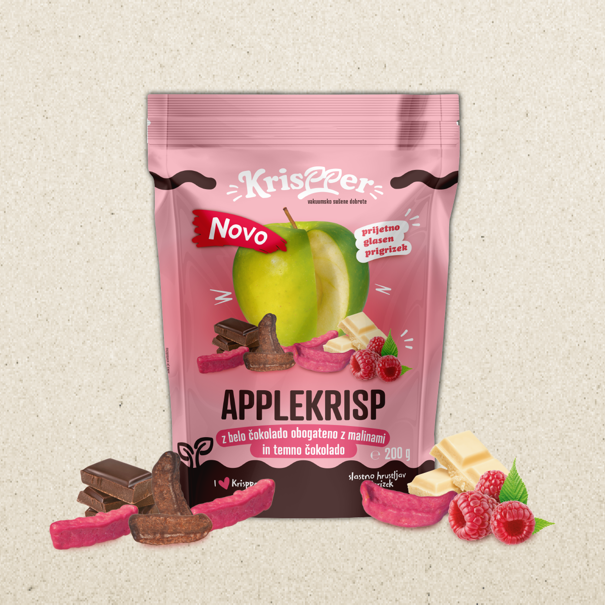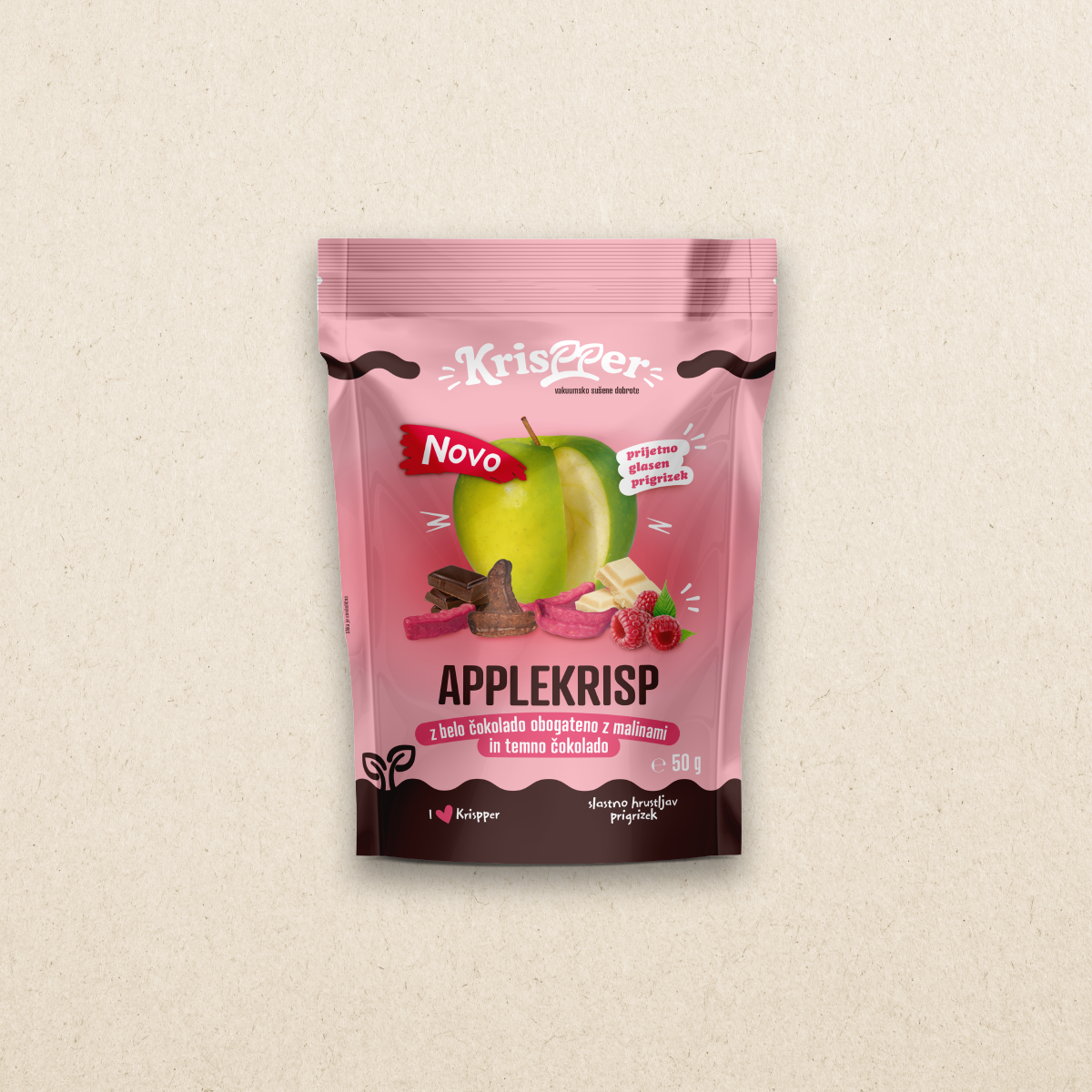 Applekrisp jabolčne palčke so hrustljav sadni prigrizek iz jabolk, oblit z belo čokolado, obogateno z malino, in temno čokolado. Združujejo sadno svežino z rahlo kislostjo maline in izrazitejšim čokoladnim okusom.