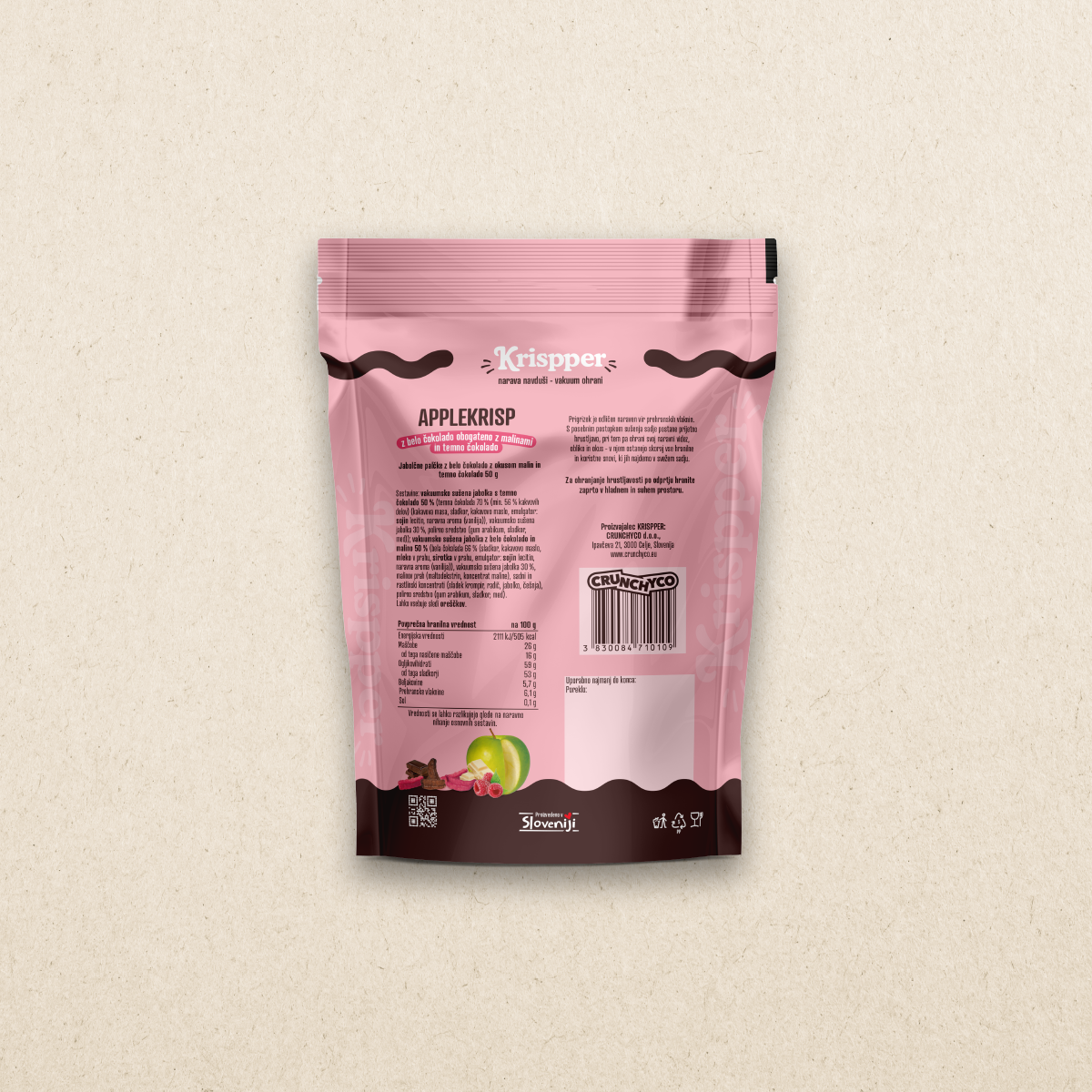 Jabolčne palčke so pripravljene z vakuumskim sušenjem pri nizki temperaturi in tlaku, brez predhodnega zamrzovanja, kar omogoča ohranjanje naravne arome, barve in strukture sadja. Po sušenju so oblite z izbranimi čokoladnimi prelivi, ki poudarijo okus in dopolnijo značilno Krispper hrustljavost.