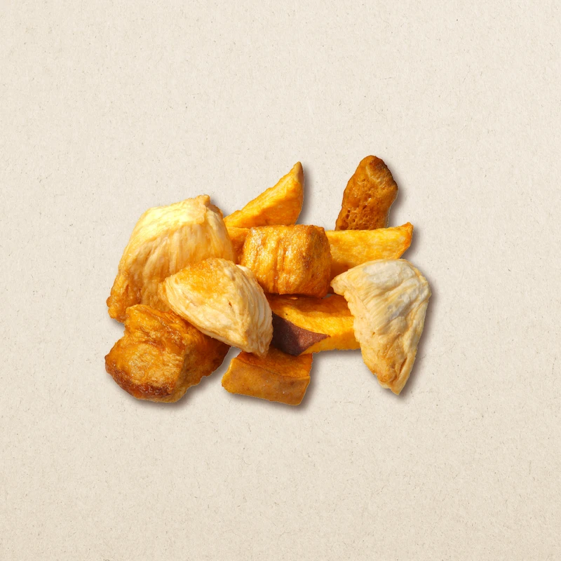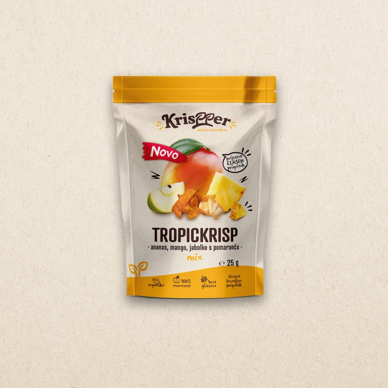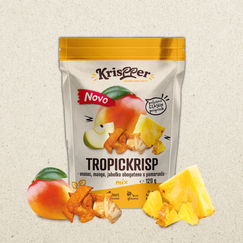 Tropickrisp sadni mix je hrustljav sadni prigrizek iz ananasa, manga in jabolčnih blazinic z okusom pomaranče. Ponuja uravnoteženo kombinacijo tropske svežine in naravne sadne sladkosti.