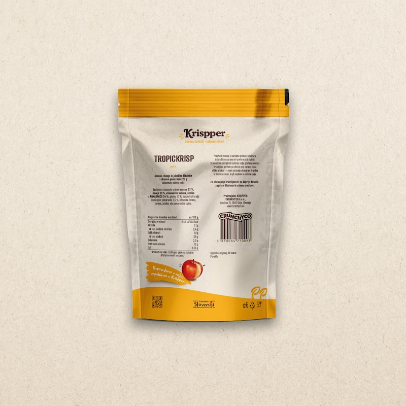 Izdelan je z edinstvenim postopkom vakuumskega sušenja pri nizki temperaturi in tlaku, brez predhodnega zamrzovanja. Ta postopek omogoča, da sadje ohrani svojo naravno aromo, barvo in hranilne snovi ter pridobi značilno Krispper hrustljavost.